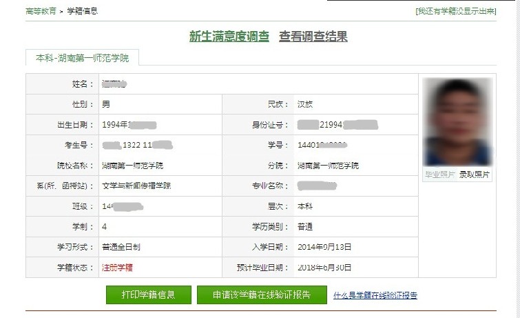 根据教育部《关于做好2014年普通高等学校录取新生复查和学籍电子注册工作的通知》(教学厅函〔2014〕28号)文件的要求,每位新生必须及时对自己的学籍电子注册信息进行查询确认,请各学院指导督促2014级各班学生及时查询本人学信网上的学籍电子注册信息。如果学生本人未亲自核查学信网学籍信息,影响到本人的毕业数据,后果由学生本人承担。现将有关事项说明如下: